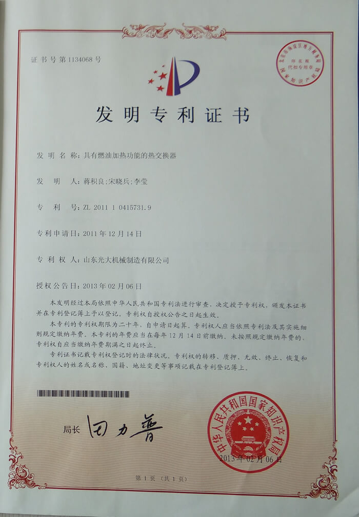 具有燃油加热功能的热交换器-发明专利证书